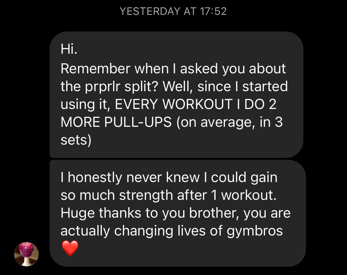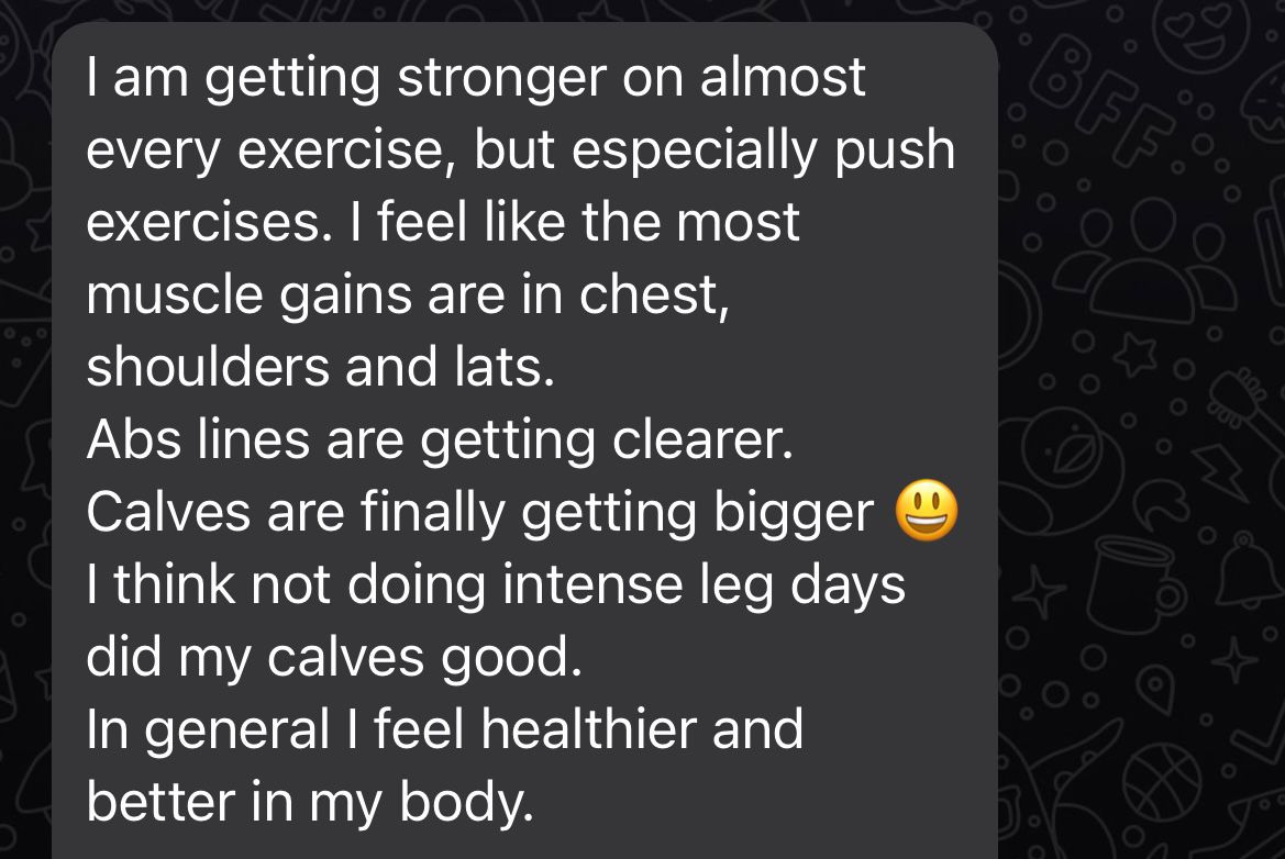 "I am getting stronger on almost every exercise, but especially push exercises! I feel like the most muscle gains are in chest, shoulders and lats. Abs lines are getting clearer.